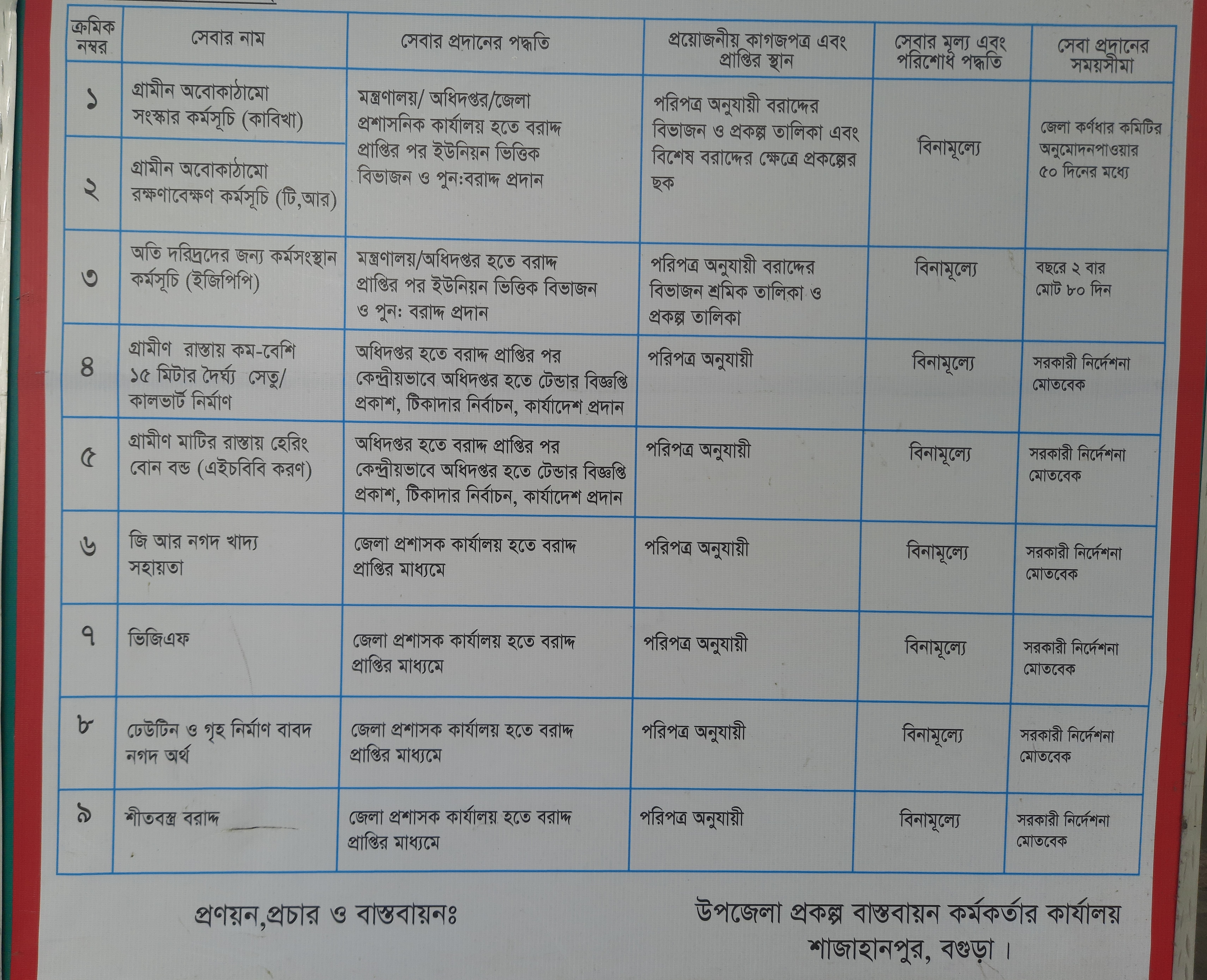 | আপদকালিন সময়ে অতিদরিদ্রের জন্য কর্মসৃজন কর্মসূচীর প্রকল্প গ্রহণ, অনুমোদন ও বাসত্মবায়ন সহ ৮০দিনের কর্মসূচির আওতায় গরিব ও অসহায় জনসাধারণকে আর্থিক সহায়তা করা হয়। | উপজেলার দরিদ্র ও দুঃস্থ জনগোষ্ঠী | চলমান কার্যক্রম | উপজেলা প্রকল্প বাসত্মবায়ন কর্মকর্তা ও উপজেলা নির্বাহি অফিসার, শাজাহানপুর, বগুড়া।